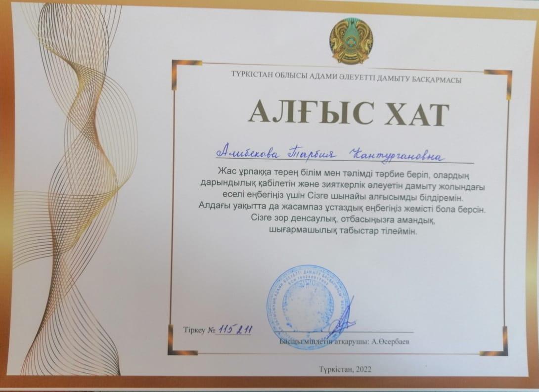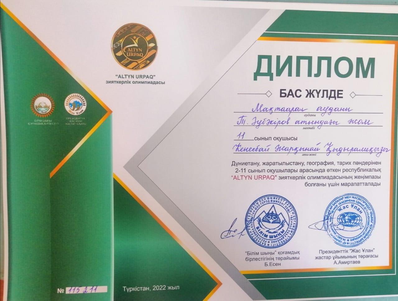 Түркістан облысы, Мақтаарал ауданы, Адами әлеуетті дамыту бөліміне қарасты "Т.Әубәкіров атындағы #43 жалпы орта мектебі" коммуналдық мемлекеттік мекемесінің Тарих пəні мұғалімі Алибекова Тарбия Кантургановнаның жетекшілігімен «Білім шыңы» орталығы жəне Президенттік “Жас Ұлан” жастар ұйымының ұйымдастыруымен "ALTYN URPAQ -2022" зияткерлік байқауына 11 сынып оқушысы, мектебіміздің үздік оқушысы, "Алтын белгіге" үміткер, пән олимпиадасы және шығармашылық жоба жұмыстарының жүлдегері Кеңесбай Жарқынай қатысып, Бас жүлдені жеңіп алды.